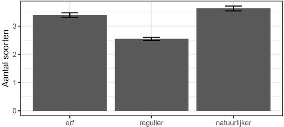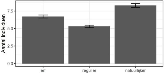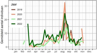 De vier jaar dat BIMAG nu loopt, is te kort om uitspraken te doen over de aantalsontwikkeling van de nacht- en dagvlindersoorten in het agrarisch gebied door de jaren heen, omdat er simpelweg te grote jaarlijkse fluctuaties zijn. Wel zien we dat natuurvriendelijke maatregelen als kruidenrijke graslanden, bloemrijke akkerranden, heggen en struwelen gemiddeld hogere aantallen individuen en soorten herbergen dan regulier beheerde percelen. Ook het erf is relatief soortenrijk. Natuurmaatregelen die boeren nemen, hebben dus een positief effect op de aantallen en soorten nachtvlinders.