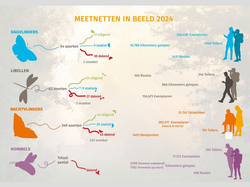 De Vlinderbalans combineert de jaarverslagen van de meetnetten vlinders, libellen, nachtvlinders en hommels met voorbeelden van de beschermingsaanpak van De Vlinderstichting. 2024 is het zoveelste jaar op rij dat laat zien dat het met een groot deel niet goed gaat. De veelal negatieve trends geven een krachtig signaal. Onze natuur staat op een kantelpunt en actie is nodig.