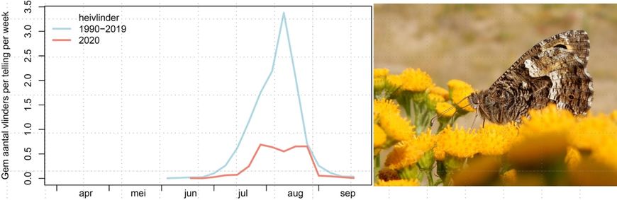 De vlinders van de heide hebben het opnieuw heel moeilijk gehad. Vanaf 2018, toen het ook al erg droog en heet was, zien we soorten als kommavlinder en heivlinder het erg slecht doen, vooral op de binnenlandse vliegplaatsen. In de duinen gaat het minder slecht.