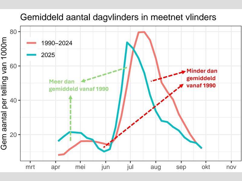 Gemiddelde aantal vlinders in een monitoringroute van een kilometer lengte in 2025 (groenblauwe lijn) en in de periode 1990 tot en met 2024 (rode lijn) (Bron: meetnet vlinders) Gemiddelde aantal vlinders in een monitoringroute van een kilometer lengte in 2025 (groenblauwe lijn) en in de periode 1990 tot en met 2024 (rode lijn) (Bron: meetnet vlinders)