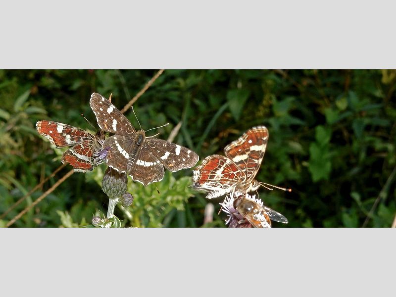 Het landkaartje is een bijzondere vlinder om meerdere redenen. Het is niet een vlinder die hier al lange tijd voorkomt. In de veertiger jaren van de vorige eeuw verschenen de eerste, en langzamerhand hebben ze heel Nederland bezet. Maar Groot-Brittannië bijvoorbeeld, is nog niet bereikt. Ondanks vele pogingen van Britten om de soort een handje te helpen, heeft deze nog steeds geen vaste voet gekregen aan de overkant van de Noordzee. Hier was het dus een vlinder die twee generaties had, en het bijzondere is dat deze er totaal anders uitzien, met name aan de bovenzijde. De voorjaarsgeneratie, die in april en mei vliegt, is oranje van kleur met wat donkere vlekken en lijnen. Uit de eitjes die de vrouwtjes van deze generatie afzetten, komen in de zomer uiteindelijk zwarte vlinders met een witte band over de vleugels. De derde generatie, die nu dus zo massaal aanwezig is, komt qua kleur overeen met de zwart-witte zomergeneratie, alleen is de witte band vaak wat meer crème gekleurd en niet zo helwit. De vlinders die nu vliegen, zullen zich de komende weken voortplanten en de poppen gaan de winter in, waaruit volgend voorjaar weer oranje landkaartjes tevoorschijn komen.
