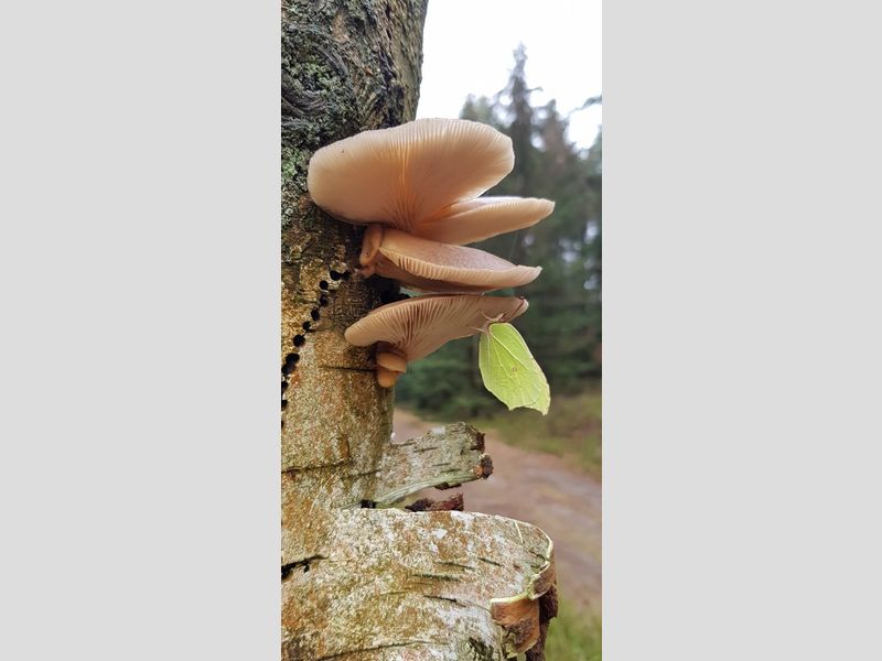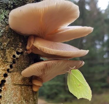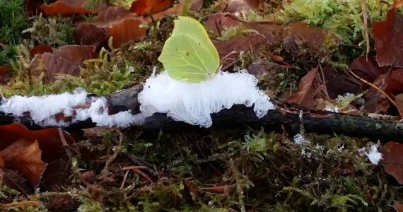 Daniël Wassenaar wilde voor het maken van deze foto even het blaadje van de paddenstoelen afvegen, tot hij er achterkwam dat het een vlinder was! Deze citroenvlinder heeft de onderkant van een paddenstoel als tijdelijke rustplek gekozen. Het komt vaker voor dat ze op zonnige winterdagen hun schuilplaats verlaten om op een andere plek de overwintering te vervolgen. In het voorjaar worden ze weer 'echt' actief.