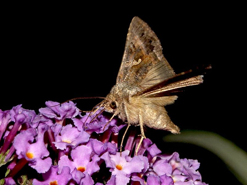 Hij heeft zijn naam niet voor niets gekregen, de vlinderstruik (Buddleia davidii) is een echte vlinderlokker. Vooral voor de kroeglopers zoals dagpauwoog, kleine vos en koolwitjes zitten er graag en lang nectar op te drinken. In het zuiden van ons land is ook de koninginnenpage een regelmatige bezoeker. Sommige mensen zullen zich herinneren dat ook op de camping in Spanje of Frankrijk er een waar vlinderfeest in werd gehouden. Keizersmantels, grote parelmoervlinders en blauwe ijsvogelvlinders vormen daar de vlinderstruikbezetting. Minder bekend is dat de struik ook ’s nachts in trek is. De gamma-uil, een trekvlindertje uit Zuid-Europa is nu met vele duizenden in Nederland aanwezig en overdag zie je ze ook al regelmatig vliegen. Als het donker wordt zijn ze rondom de bloeiende buddleia-bloemen te vinden. Deze nachtvlinder gaat er niet vaak echt op zitten, maar hangt er een beetje voor terwijl hij met zijn voorpoten probeert wat houvast te krijgen. Ondertussen verdwijnt de lange roltong diep in de bloem om er maar zoveel mogelijk voedsel uit te halen.