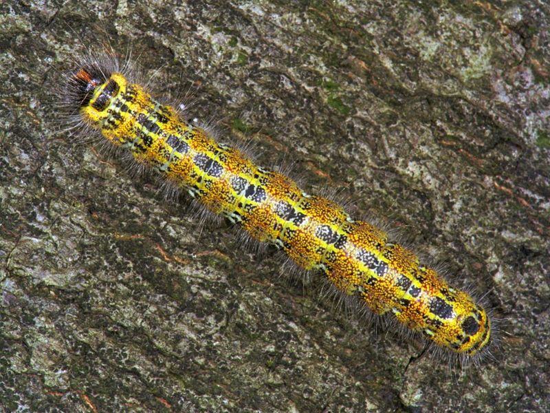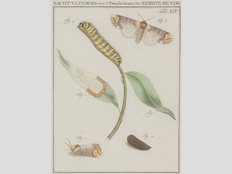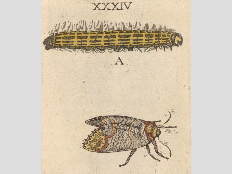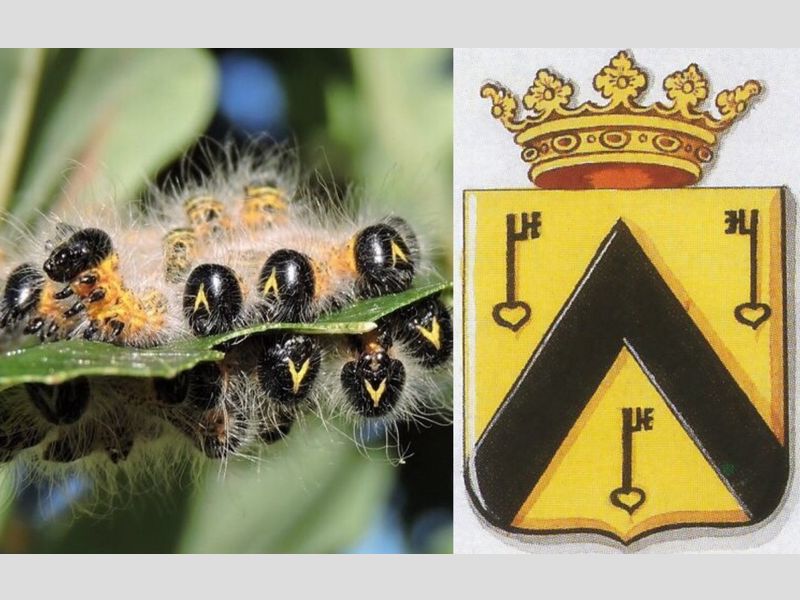 'Dese Rupsen sijn schoon van koleur, geel ende met swart geteyckent, dat seer wel af-steeckt. Voor aen den kop hebben sy de ghedaente van een wapen daer een keeper in staet, den grondt is swart ende den keeper geel, gelijck inde af-beeldinghe A. te sien is. (...) Om sijn gedaentes wille, gaf ick hem den naem vanden geelen-wapen-drager.'