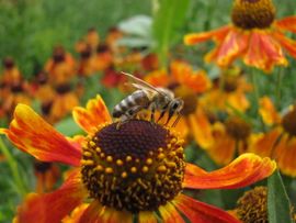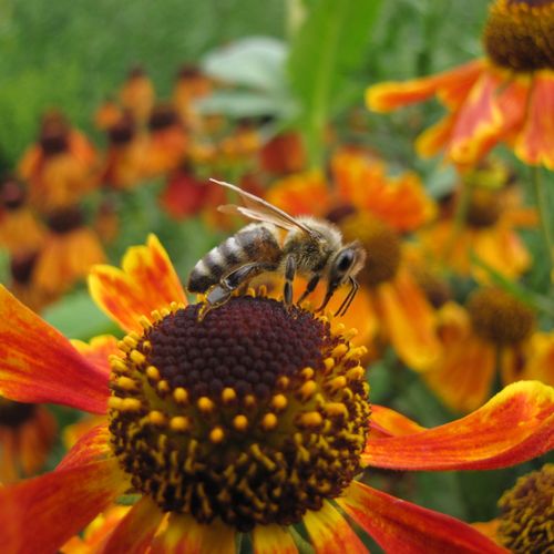 De meest voorkomende bijensoort in ons land. De werksters (vrouwelijk) worden overal op bloemen aantroffen waar ze nectar en stuifmeel verzamelen en dat naar hun volk brengen. Wilde volken komen nog zelden voor in ons land. Honingbijen worden door imkers gehouden.