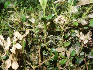 De rupsen van de buxusmot staan bekend om hun vraatzucht. Opvallende symptomen zijn dode en aan elkaar gesponnen blaadjes en ‘bladskeletten’. Er blijft niets van de struik over. In 2017 zijn dan ook al veel buxusstruikjes geëindigd in de groencontainer. De natuurlijke balans is dus ver te zoeken. Buxusmot is hier een exoot, en buxus ook. Er zijn nog geen natuurlijke vijanden van de buxusmot (al begint dat wel te komen). Gebrek aan evenwicht zorgt ervoor dat iets een plaag kan worden. We spreken dan ook wel van een 'invasieve exoot'. De rupsen worden zó talrijk, dat buxus het vaak niet redt.
