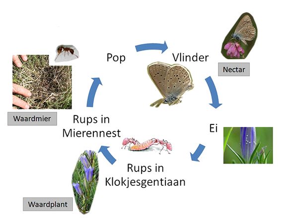 Na het verlaten van de gentianenknop laat de rups zich op de grond vallen. Onder gunstige omstandigheden wordt de rups nu door een knoopmier van het genus Myrmica geadopteerd. In Nederland en Vlaanderen betreft dit hoofdzakelijk de bossteekmier (M. ruginodis), maar de ruwknoopmier (M. scabrinodis) en de rode steekmier (M. rubra) zijn alternatieve waardmieren. Afhankelijk van de omstandigheden verblijven de rupsen tot de volgende zomer of een jaar langer in het mierennest. Uit een enkel mierennest kunnen tot wel twintig vlinders te voorschijn komen, maar meestal is het er een handvol. De vlinders moeten zien zo snel mogelijk het nest te verlaten omdat ze vanaf het moment van uitkomen als indringers worden gezien en daarom heftig worden aangevallen.