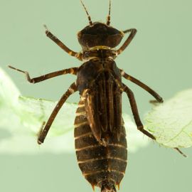 Een kleine larve met opvallende rugdoornen en ook goed zichtbaar zijn de lange zijdoornen op segment 9. De larvenhuidjes zijn meestal donker van kleur. Meestal geen donkere band op de zijkant van het borststuk.