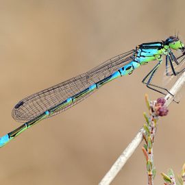 Lengte: 30-33 mm. Stevig ogende, donkere waterjuffers.