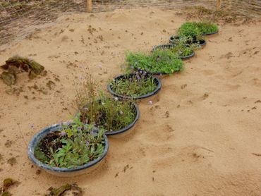 De nectarkroegen bestaan uit speciekuipen met daarin allerlei bloeiende planten. Zo staat er echte guldenroede, blauwe knoop, tijm, knoopkruid, zandblauwtje en zelfs vlinderstruiken. Die vlinderstruiken (Buddleja ‘Argus Velvet’), zijn steriel, wat wil zeggen dat ze geen zaad produceren.