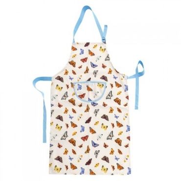 Dit mooie katoenen keukenschort van Roy Kirkham is voorzien van tekeningen van populaire vlinders. De band van de hals is verstelbaar. De tailleband knoopt u op de gewenste maat. De voorzijde is voorzien van een grote steekzak, handig voor het opbergen van keukenbenodigdheden. Afmetingen: 68 cm breed, 98 cm lang. Geschikt voor machinewas.