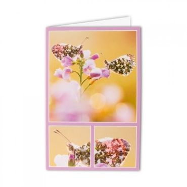 Deze dubbele wenskaart is voorzien van schitterende foto van het oranjetipje. Één grote afbeelding en twee close ups, maken deze kaart tot een uniek exemplaar voor natuurliefhebbers.