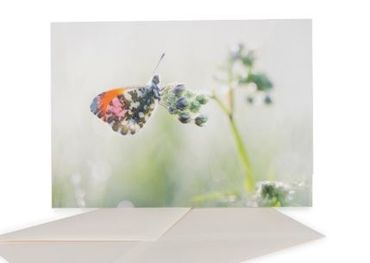 Deze dubbele wenskaart is voorzien van schitterende foto van het oranjetipje. De binnenkant is blanco en de kaart is voorzien van enveloppe. Een uniek exemplaar voor vlinderliefhebbers.