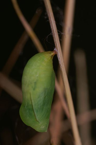 De buitenkant van de pop lijkt meer op een vlinder dan op een rups, want bij de pop zijn de drie delen, kop, borst en achterlijf, beter te zien. De grote, samengestelde ogen, puilen uit aan de zijkanten van de kop. Ook de antennen en de roltong van de vlinder zijn al te zien, over de vleugels heen gevouwen. De gordel is het zijden draadje waarmee de pop aan de stengel van de plant is vastgezet.