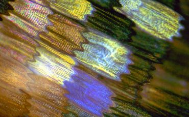De schubben kleuren door melanine, die zwarte en bruine kleuren veroorzaken, maar blauw, groen, rood en iridiserend worden meestal niet door pigmenten veroorzaakt maar door de microstructuur van de schubben (bron: Wikipedia)