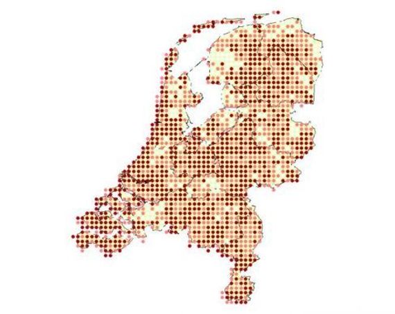 Mate van onze kennis van het aantal soorten macro-nachtvlinders in een uurhok. Hoe donkerder de stip hoe beter onze kennis. Zie het artikel: Ellis, W.N. & M.E. Huigens, Hoe ver zijn we met het inventariseren van Nederlandse nachtvlinders? Vlinders, mei 2015, p. 20 – 22. Mate van onze kennis van het aantal soorten macro-nachtvlinders in een uurhok. Hoe donkerder de stip hoe beter onze kennis. Zie het artikel: Ellis, W.N. & M.E. Huigens, Hoe ver zijn we met het inventariseren van Nederlandse nachtvlinders? Vlinders, mei 2015, p. 20 – 22.