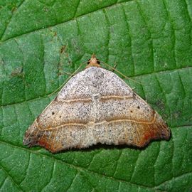 De gegolfde achterrand van de voorvleugel eindigt in een sikkelvorm en de grondkleur van de vleugels is bruin.