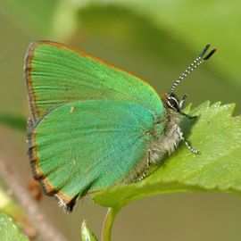 Voorvleugellengte: circa 14 mm. De bovenkant van de vleugels is effen bruin en de onderkant van de vleugels effen groen. Bij afgevlogen vlinders is de groene kleur op de onderkant van de vleugels soms gedeeltelijk verdwenen. Aan de achtervleugel bevindt zich een klein staartje.