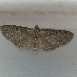 Voorvleugellengte: 10-11 mm. Deze tamelijk eentonig grijze dwergspanner wordt door veel nachtvlinderaars ervaren als een van de moeilijkst te determineren soorten; vaak is genitaliënonderzoek nodig om de soort met zekerheid vast te kunnen stellen. De vrij grote en langgerekte middenstip valt meestal goed op en ligt niet in het midden van de vleugel, maar dichter naar de vleugelwortel toe. Langs de voorrand liggen vaak donkere vlekjes en blokjes en aan de buitenzijde van de middenband ligt meestal een rij stippen. De golflijn is goed ontwikkeld en soms is zelfs een duidelijk vlekje in de binnenrandhoek te zien. Over de voorvleugel lopen lichte dwarslijnen en enkele aders zijn zichtbaar als zwarte streepjeslijnen. Op het borststuk is meestal een driehoekige witte stip aanwezig De mannetjes hebben in vergelijking met gelijkende soorten opvallend geveerde antennen.