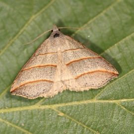 Voorvleugellengte: 13-15 mm. De rusthouding van deze snuituil doet enigszins denken aan een deltavorm met scherpe hoekpunten. De voorvleugel heeft een lichtgrijze grondkleur met een fijne donkere spikkeling. Kenmerkend zijn de drie roodachtig bruine dwarslijnen, waarvan de buitenste via een gelijkmatige boog in de vleugelpunt eindigt; de dwarslijnen zijn afgezet met een geelachtige rand.
