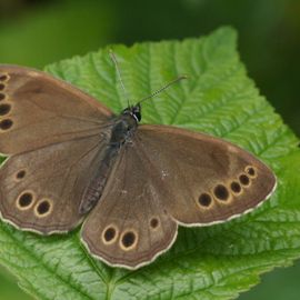 Voorvleugellengte: circa 25 mm. De grondkleur van de vleugels is grijsachtig bruin. Zowel op de boven- als op de onderkant van de voor- en de achtervleugel staat een rij grote geelgerande zwarte oogvlekken. Op de onderkant van de vleugels zijn de oogvlekken witgekernd; op de achtervleugel liggen ze in een witte band.