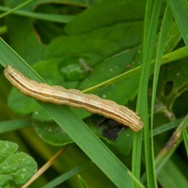 Tot 20 mm; slank en naar de staart iets versmald; lichaam geel of roodachtig bruin met over de rug een donkere middenstreep en aan weerszijden daarvan een lichte lengtestreep; langs de zwarte spiracula een roodachtige lengtestreep; ronde, bruine kop.