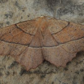 Voorvleugellengte: ♂ 20-23 mm, ♀ 35-38 mm. De voorvleugel van het vrouwtje is geelachtig bruingrijs, die van het mannetje meer roodachtig grijs. Over de voorvleugel lopen tamelijk rechte donkere dwarslijnen die aan een kant zijn afgezet met een witte lijn. In de spitse vleugelpunt bevindt zich een donker lijntje. De geschulpte achterrand van zowel de voor- als de achtervleugel heeft een stompe hoek en op alle vier de vleugels bevindt zich een kleine donkere middenstip.