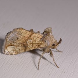 Voorvleugellengte: 17-20 mm. Deze uil heeft een grote waaiervormige kuif op de bovenzijde van het borststuk; verderop op het borststuk en het achterlijf zijn nog twee kuifjes zichtbaar. De kleur van de brede voorvleugel is een mengeling van bruin, grijs en goudgeel, met soms in het zoomveld een groenachtige tint. De verhouding tussen de verschillende kleuren varieert; sommige vlinders maken een lichte en vooral grijze indruk, andere zijn donkerder en overheersend bruin. De vleugelzoom is vaak iets lichter; opvallend is vooral de grote witachtige vlek in de vleugelpunt. Karakteristiek is de breed zilverachtig wit geringde vlek in het midden van de voorvleugel; deze vlek lijkt uit twee grote aaneengesloten ringvlekken te bestaan. Aan de buitenzijde hiervan bevindt zich een in het midden scherp gehoekte zwartachtige middelste dwarslijn. Soms komen exemplaren voor met een bruine voorvleugel met grote zwarte vlekken langs de achterrand.