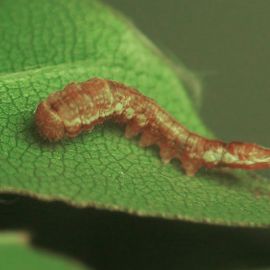 Tot 24 mm; vrij slank, naar de spitse staart versmald; lichaam bleekbruin met een fijn netwerk van donkerbruine en zwartachtige streepjes; segmenten vijf tot tien met een geelachtige, zadelvormige vlek op de rugzijde; segment drie met een grote, gevorkte wrat op de rug; kop lichtbruin met donkerder stipjes, ingesneden.