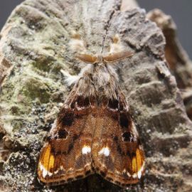 Het mannetje van deze soort heeft een paar opmerkelijke vlekken of stippen in de hoeken van de voorvleugel.