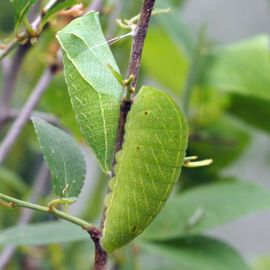 Tot 40 mm; zeer plompe rups die naar beide uiteinden smal toeloopt; lichaam groen met een geelachtige streep over het midden van de rug en aan weerszijden een rij schuine geelachtige strepen waarin kleine verheven rode of gele vlekjes zijn geplaatst; kop groen, vaak in het lichaam teruggetrokken.