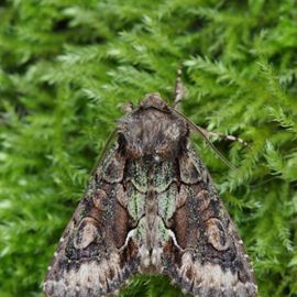 Voorvleugellengte: 17-20 mm. De voorvleugel van deze uil heeft een bruine grondkleur met een variabele koper- tot donkergroene bestuiving, vooral langs de binnenrand en de achterrand. De buitenste dwarslijn heeft vlak bij de binnenrand vaak een kenmerkende witte afzetting, die als een witte halvemaanvormige vlek zichtbaar is. De uilvlekken zijn duidelijk; vooral de niervlek is opvallend groot. Kenmerkend is ook de vrij dikke zwarte schouderstreep die in combinatie met de binnenste dwarslijn soms een soort pijl-en-boog-figuur vormt. Soms komen donkere exemplaren voor.