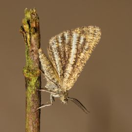 Voorvleugellengte: 13-15 mm. Zowel het mannetje als het vrouwtje hebben oranjegele vleugels met een chocoladebruine zoom, die bij het vrouwtje iets minder duidelijk is. De op de voor- en achtervleugel aanwezige bruine bestuiving kan variëren, waardoor sommige exemplaren meer bruingrijs van kleur zijn. De vleugels hebben enigszins afgeronde punten. In rust worden de vleugels boven de rug naar elkaar toe gevouwen zoals bij dagvlinders en wordt de groenbruine onderzijde van de achtervleugel met de sterke spikkeling en de witte strepen zichtbaar. Het mannetje heeft geveerde antennen.