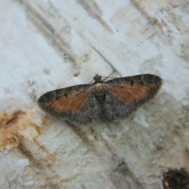 Bij veel vlinders van deze dwergspanner is een opvallende grote oranje vlek op de voorvleugels te zien.