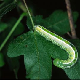 Tot 30 mm; lichaam bleek blauwachtig groen met bleek geelachtig groene lijnen tussen de segmenten; over de rug twee brede, groenachtig witte lengtestrepen en over de spiracula een geelachtige lengtestreep; kop groen.