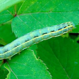 Tot 65 mm; groot en plomp; lichaam helder groen; over de rug twee gele lengtestrepen met daartussen een rij witgekernde, zwarte vlekken die echter soms ontbreken; onder de spiracula een witte lengtestreep met langs de bovenrand een gebroken, helder rode lengtestreep; kop bruinachtig groen tot geelachtig groen.