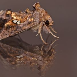 De ni-uil (Trichoplusia ni) mist de goudkleurige glans op de voorvleugel. Zie ook de getekende gamma-uil (Macdunnoughia confusa).
