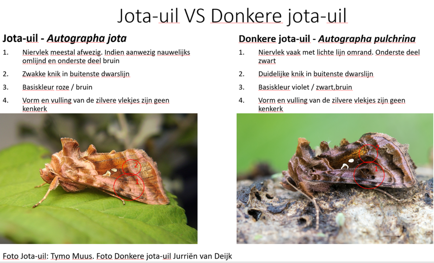 De donkere jota-uil (A. pulchrina) en de jota-uil (A. jota) zijn sterk op elkaar lijkende soorten. Daarnaast lijken ze oppervlakkig gezien ook op de gamma-uil (A. gamma), maar die is veel grijzer en contrastarmer. Toch zijn ze goed uit elkaar te houden op grond van de onderstaande kenmerken, met name als die kenmerken samen voorkomen.