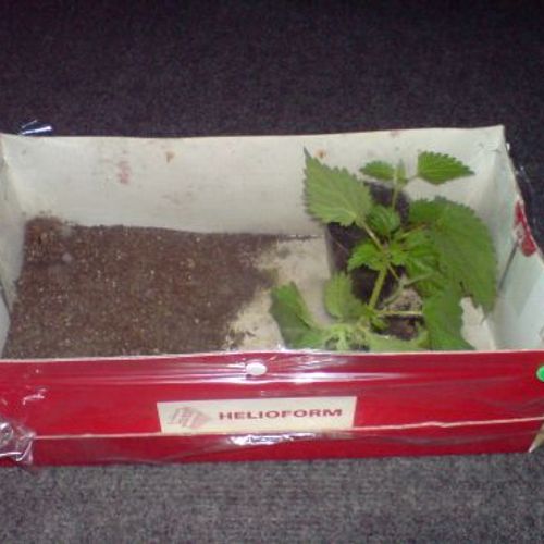 Neem een bakje van bijvoorbeeld plastic. Het is ook mogelijk een kartonnen doos, bijvoorbeeld een schoenendoos, te nemen waardoor vrijkomend vocht wordt geabsorbeerd in plaats van op de wanden terecht te komen. Hierdoor ontstaat minder vervuiling en daardoor ook minder kans op schimmelvorming en ziekte. Een glazen pot is niet aan te raden omdat het vocht er moeilijk uit kan en de pot vanwege de smalle opening moeilijk schoon te houden is.